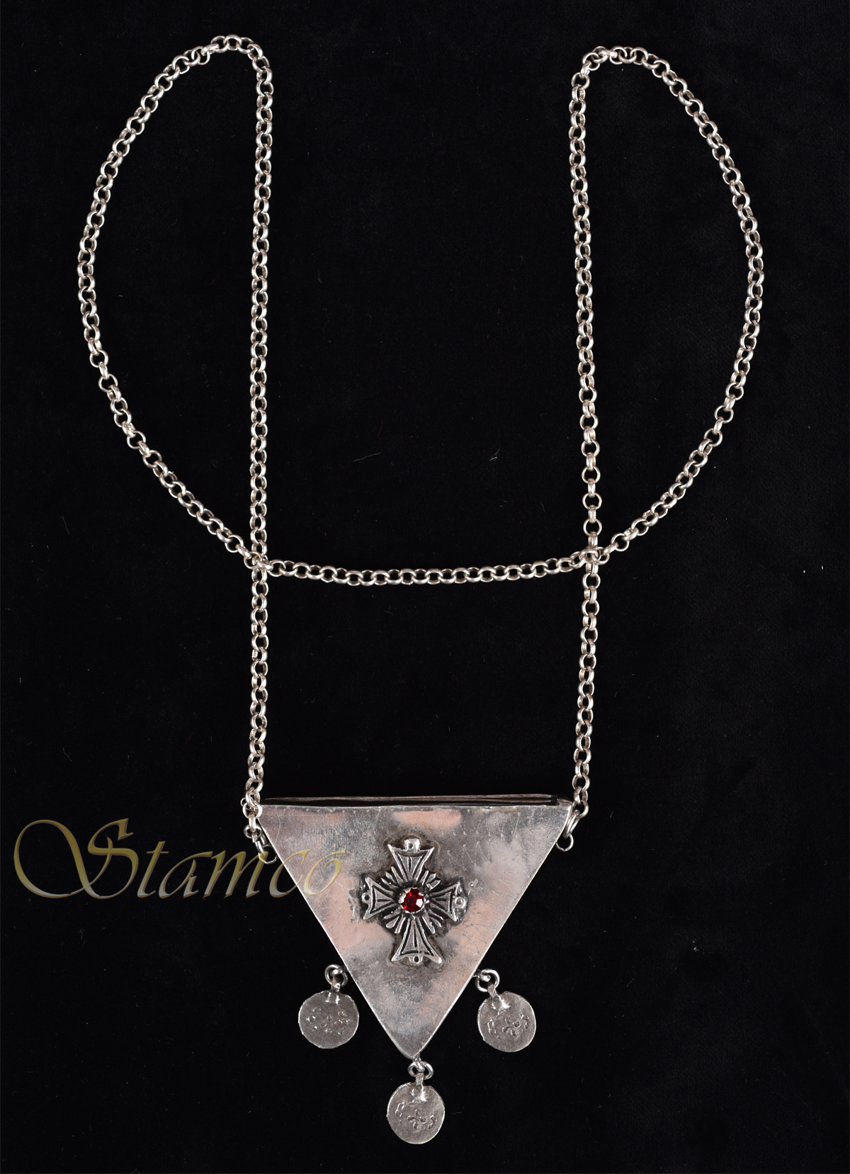 Ένα πολύ όμορφο ασημένιο κόσμημα σε τριγωνικό σχήμα. Στην όψη του έχει το Σταυρό με μία κόκκινη πέτρα ενώ συμπληρώνεται από μακριά αλυσίδα και 3 ασημένια φλουριά.